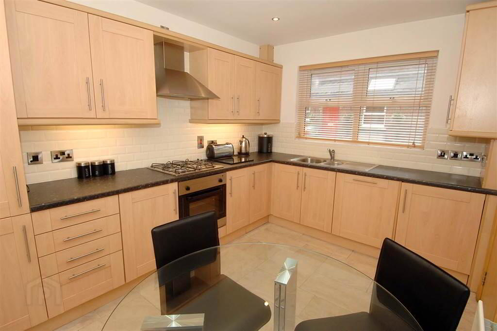 Excellent range of high to low-level fitted units. Integrated fridge-freezer. Integrated dishwasher. Integrated oven and four ring gas hob. Stainless steel chimney style extractor fan with hood. Plumbed for washing machine. 1.5 drainer stainless steel sink unit with mixer tap. Enclosed gas boiler. Ceramic tiled floor. Partially tiled walls. Concealed spotlights.