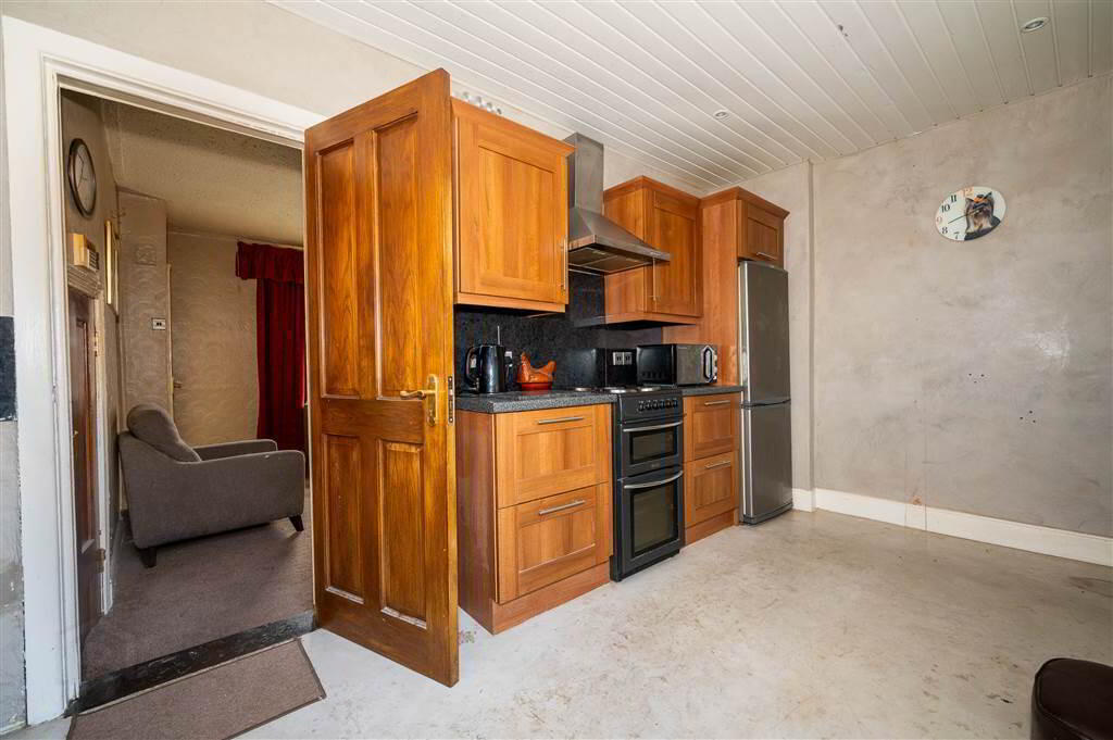 At widest points. Fitted kitchen with range of high to low-level fitted units. Formica worktops. Single drainer sink unit. Integrated oven and electric four ring hob. Extractor fan with hood. Integrated fridge freezer. Partially tiled walls. Cream laminate flooring.
