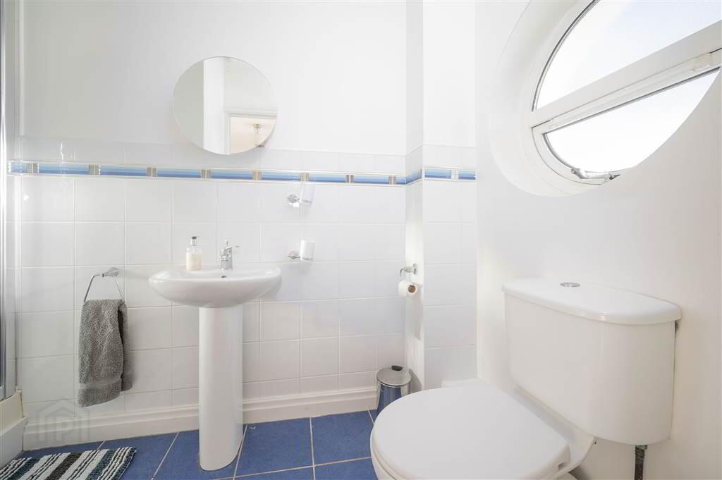 Tiled shower enclosure. Pedestal wash hand basin with mixer taps. Low flush W/C. Partially tiled walls and tiled floor. Porthole window. Extractor fan.