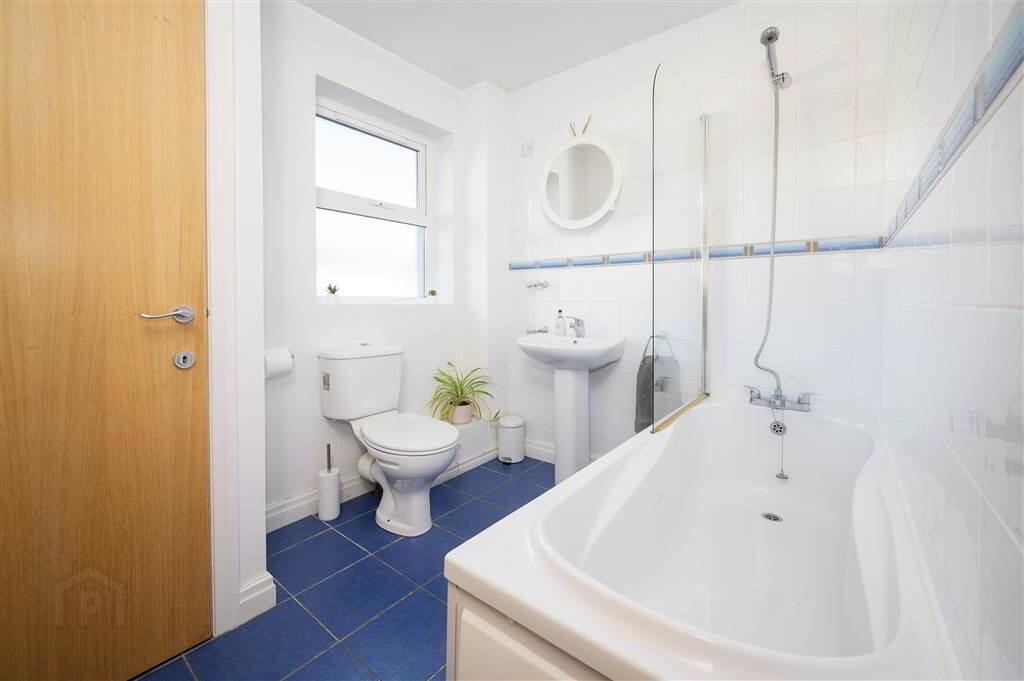 White bathroom suite comprising panelled bath with shower screen and attachment. Pedestal wash hand basin with mixer taps and tiled splash back. Low flush W/C. Partially tiled walls and tiled floor. Extractor fan.