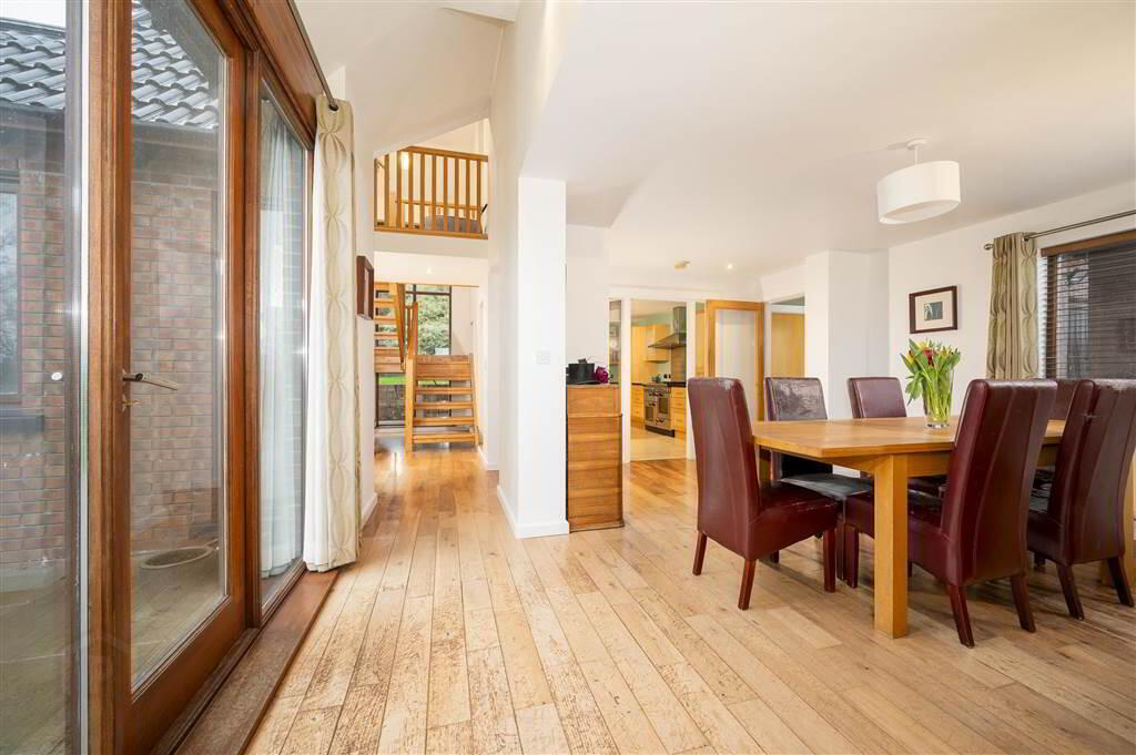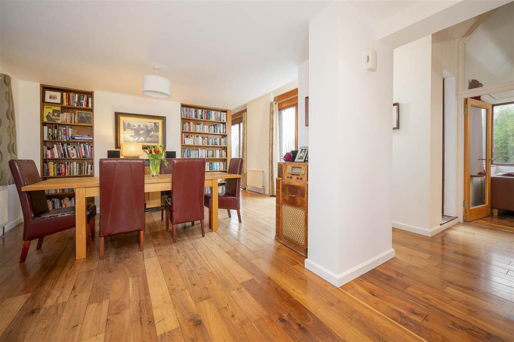 Central open plan ground floor dining room, access to side gardens. Floor to ceiling book shelving. Walnut solid wood flooring throughout leading to…