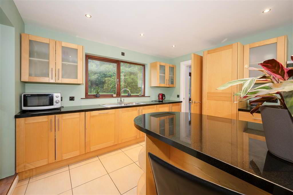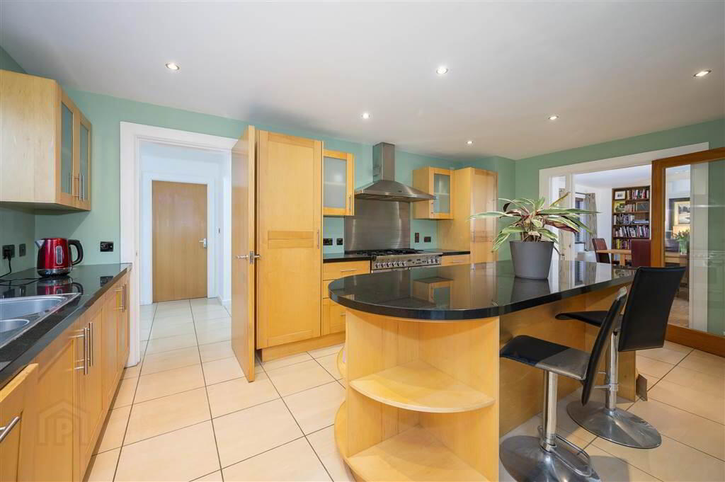 Luxury fitted kitchen, granite work surfaces, breakfast bar with island and an extensive range of high and low-level units,1.5 stainless steel sink drainer, “Rangemaster “electric double over, 5 ring gas hob. Integrated chimney style stainless steel extractor fan. Integrated dishwasher and fridge freezer. Concealed spotlighting, ceramic tiled floor.