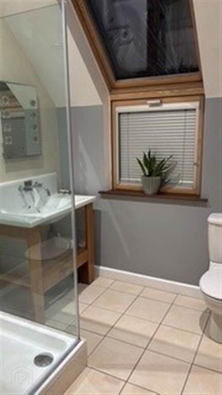 Walk-in shower cubicle. Free standing wc. Pedestal wash hand basin with tiled splash back, Ceramic tiled floor. Partially tiled walls. Concealed Spotlights.