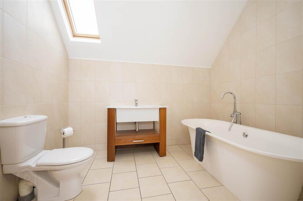 White suite comprising “Victoria Albert” free standing bath with floor tap and handle shower attachment, pedestal wash hand basin with tiled splash back, low flush wc, Velux window, extractor fan. Enclosed shelved storage.