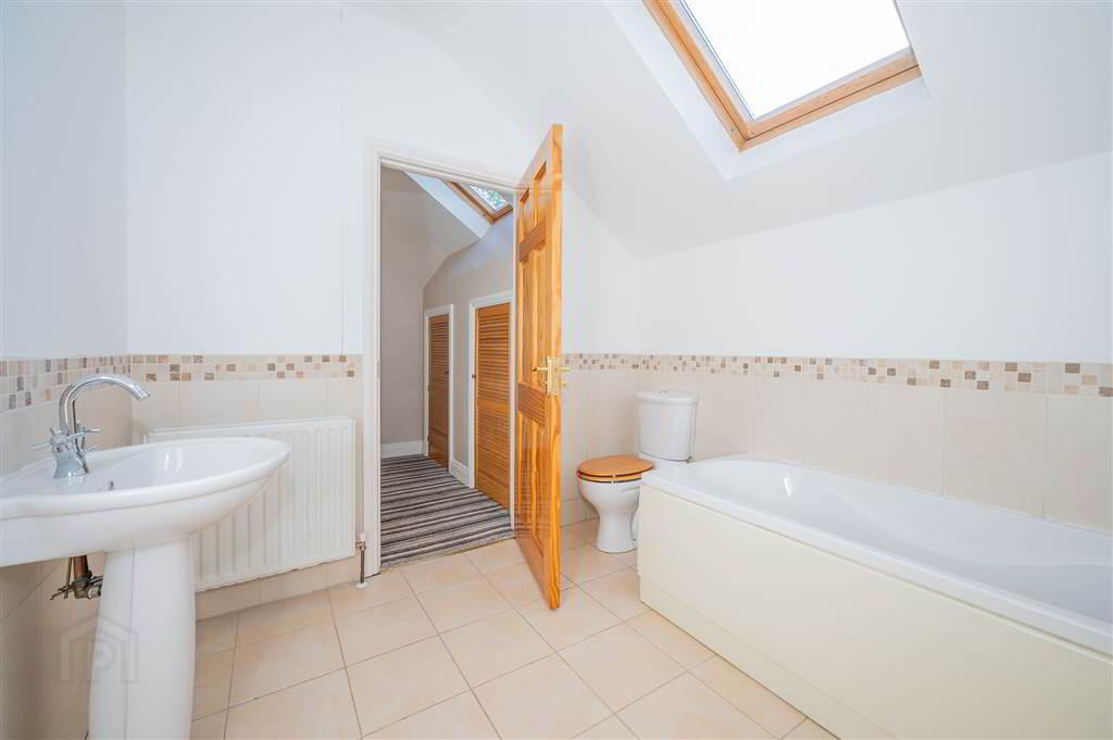 Ceramic tiled floor, pedestal sink unit, low flush wc, panelled bath with handheld shower attachment. Partially tiled walls. Velux window.